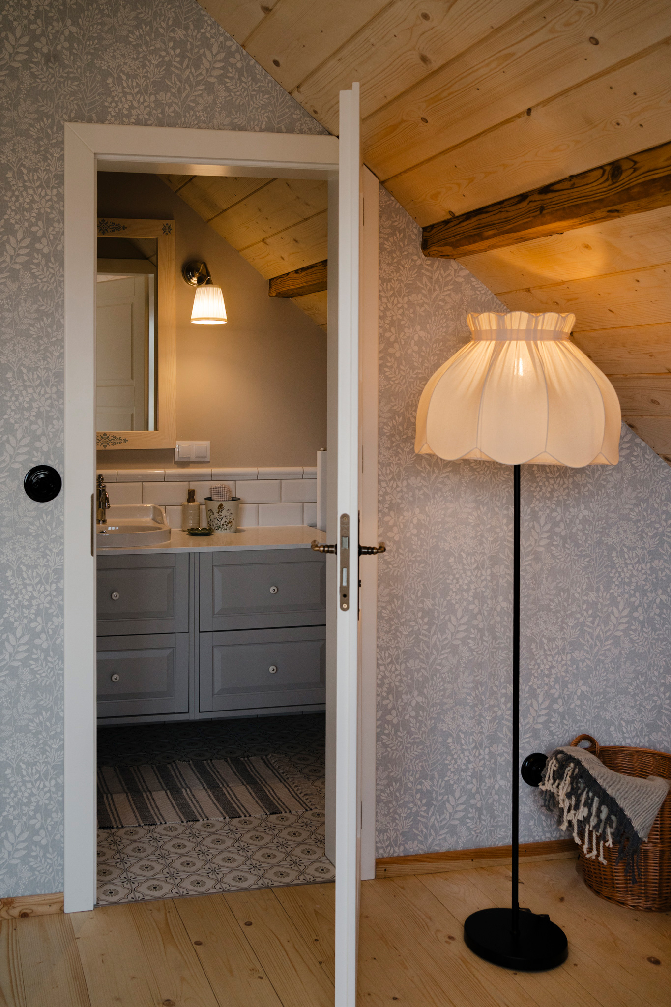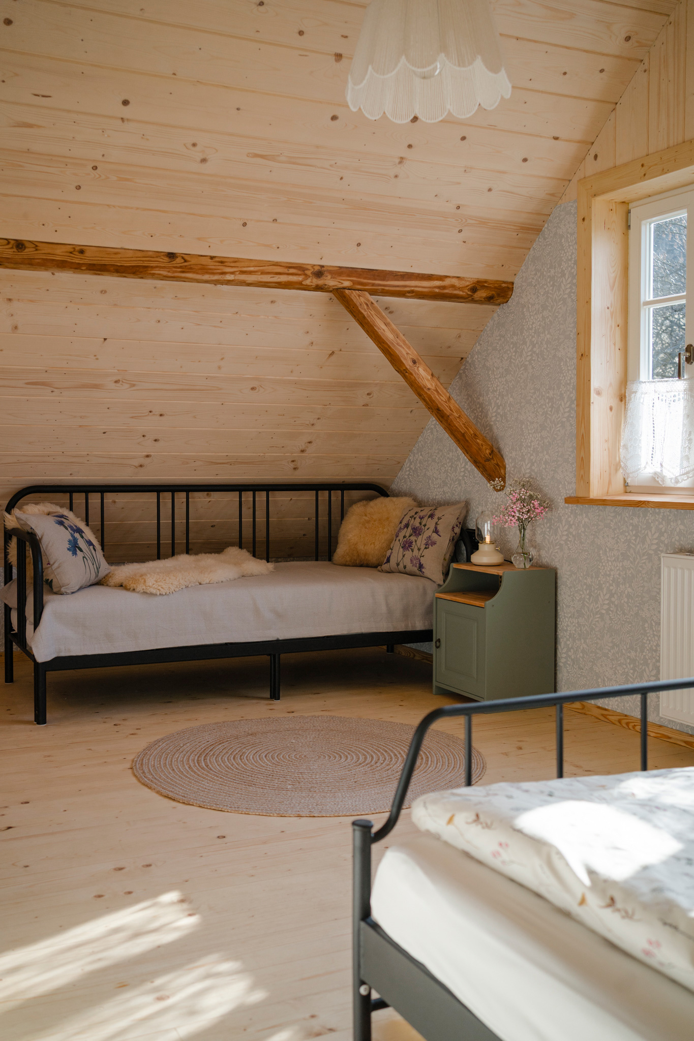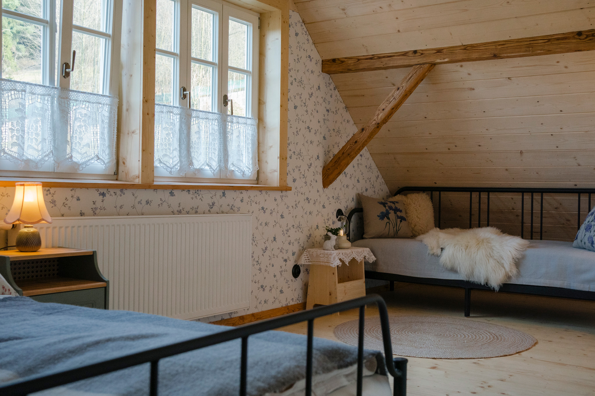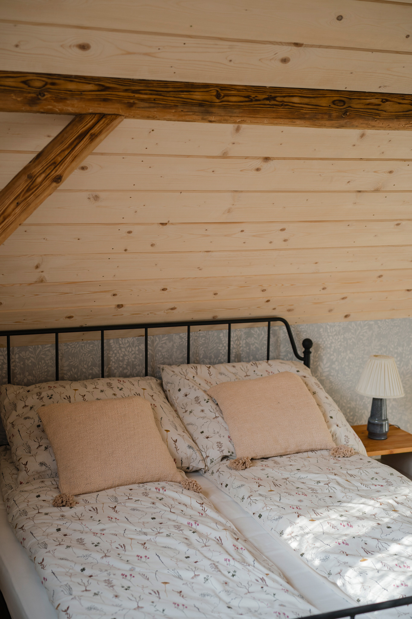 – Na piętrze znajdują się dwa przytulne pokoje. W każdym z nich jest łóżko dwuosobowe oraz możliwość przygotowania dodatkowych dwóch miejsc do spania. Każdy pokój posiada własną łazienkę z prysznicem.
